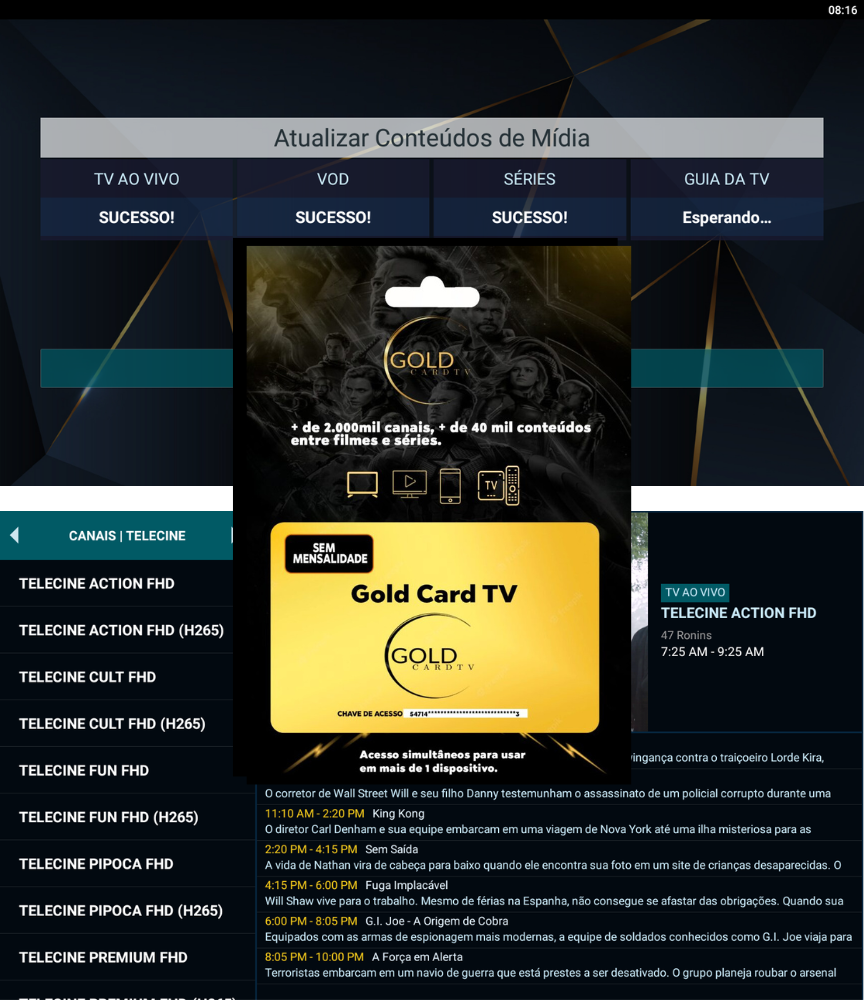GoldCard  vai com o acesso  que pega todos os Canais sem mensalidade.