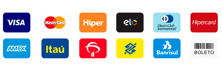Aceitamos os cartões de crédito mais usados: Visa, Mastercard e outros. Dividimos em até 12x no cartão ou você também pode optar por pagamento por boleto bancário ou pix.