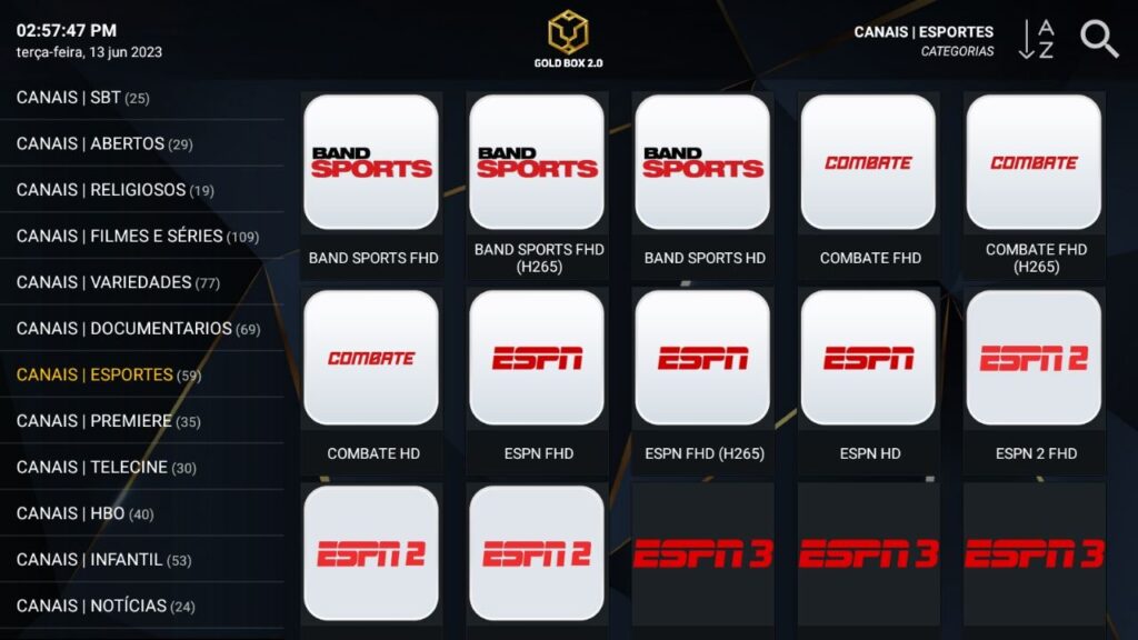 Aqui nosso time entra em campo todos os dias com todos os canais de esportes + PREMIERE + COMBATE + DAZN + COMEBOOL e muito mais.